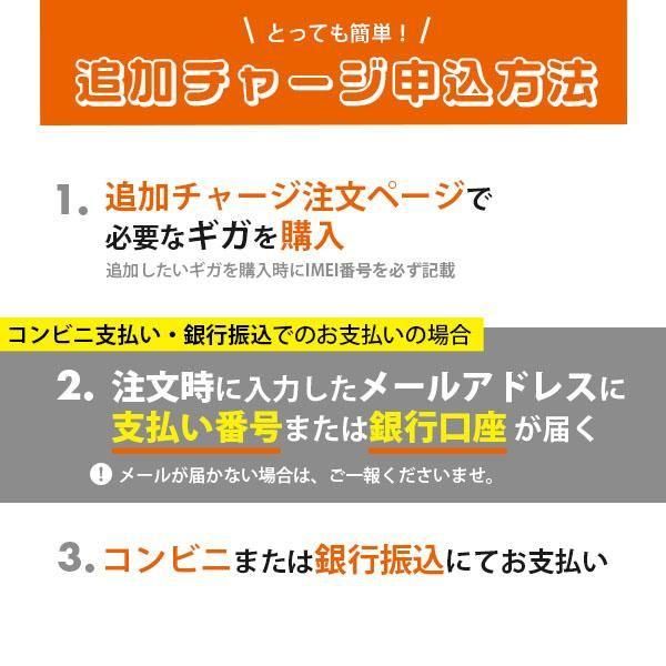 1.追加チャージ注文ページで必要なギガを購入※追加したいギガを購入時にIMEI番号を必ず記載